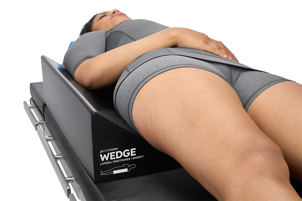 When it is desirable for the patient to be positioned in a stable semi-lateral position anywhere between 24 and 45 degrees, the BoneFoam lateral Wedge positioner provides the perfect support and comfort.